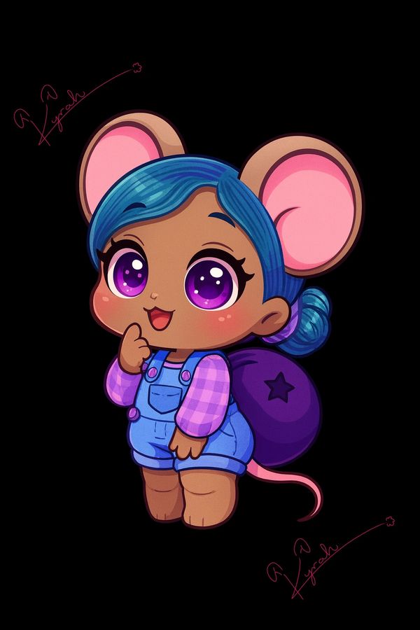 Jubilee is a blueberry‑coded magical mouse girl with the softest sparkle in the Bunnyverse. At just 1.25 years old, she’s the gentle, cautious heart of the burrow — the one who reads the spell twice, checks the wind three times, and still whispers, “Um… one more time?” before she casts it. Her magic feels like a quiet evening breeze, a cozy blanket, and a shy little giggle wrapped in blueberry glow.